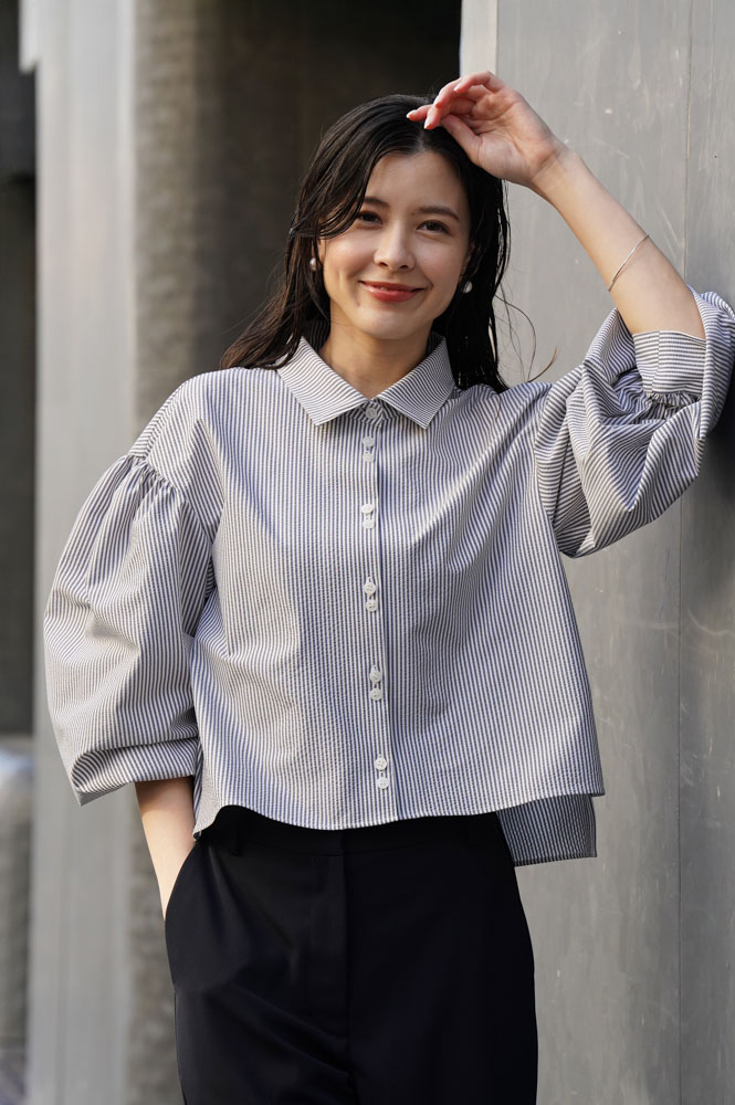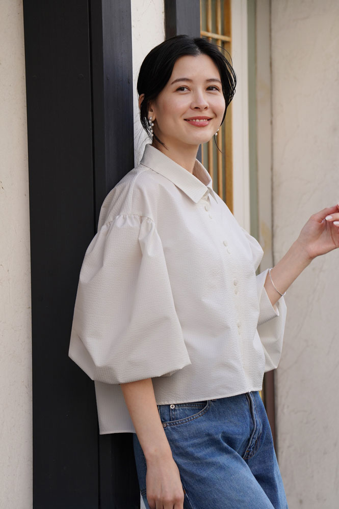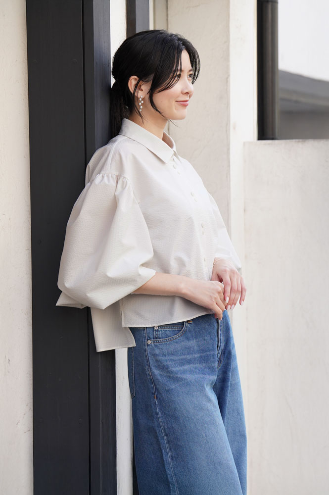 凹凸のある表情豊かなサッカー素材で仕立てた、今季注目のクロップド丈シャツ。