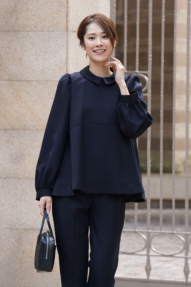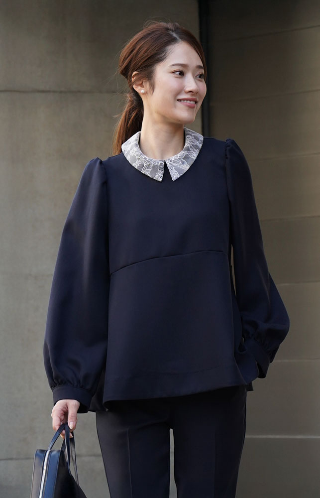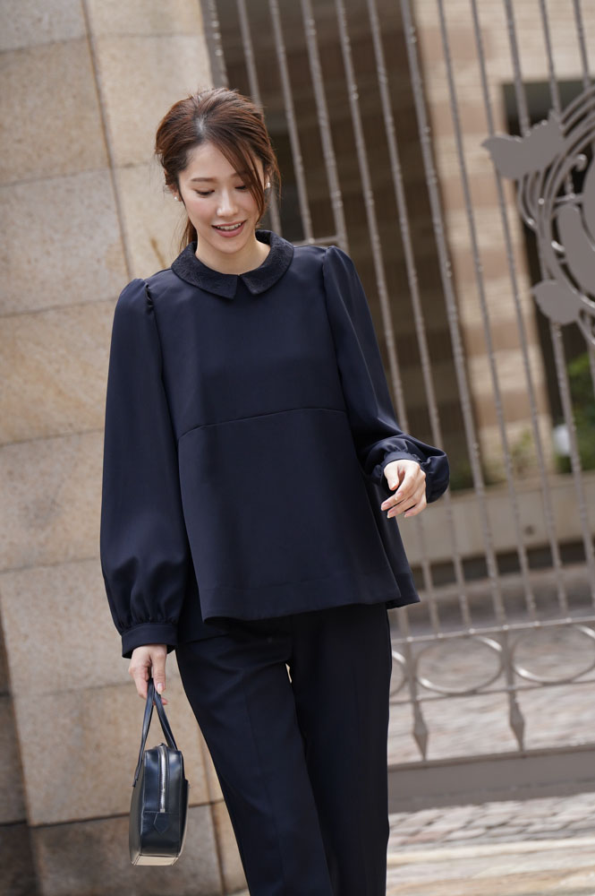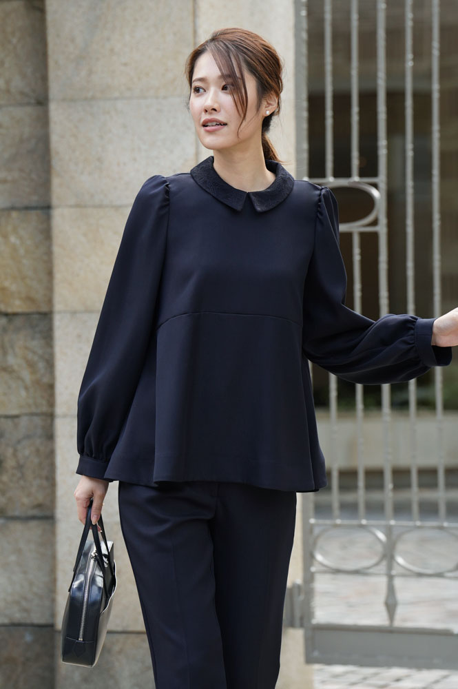 クラシカルで可愛いレース襟と、ペプラムから裾に向かって広がるフレアシルエットが絶妙なバランスを生み出すブラウス。