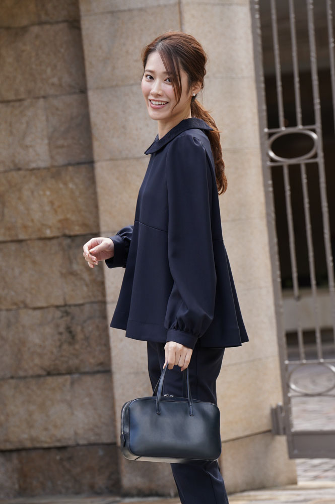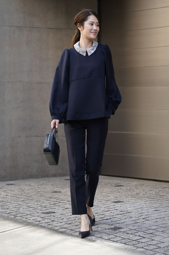 身生地と同色のレースをあしらったネイビーは落ち着いた上品な印象で、スタイルにリュクス感をプラス。