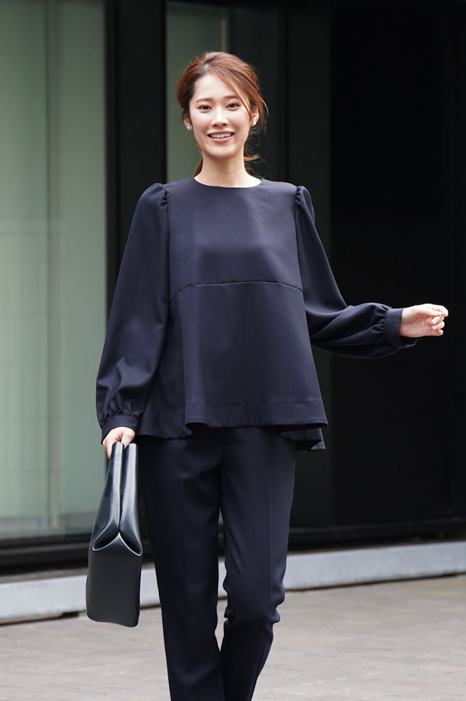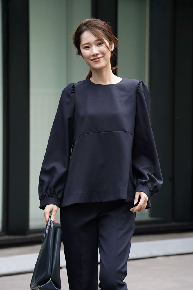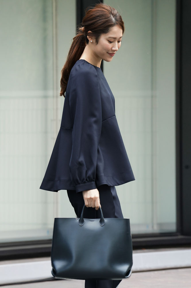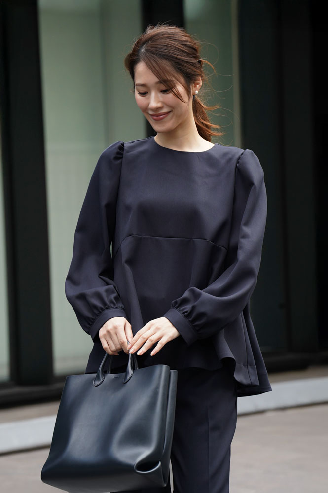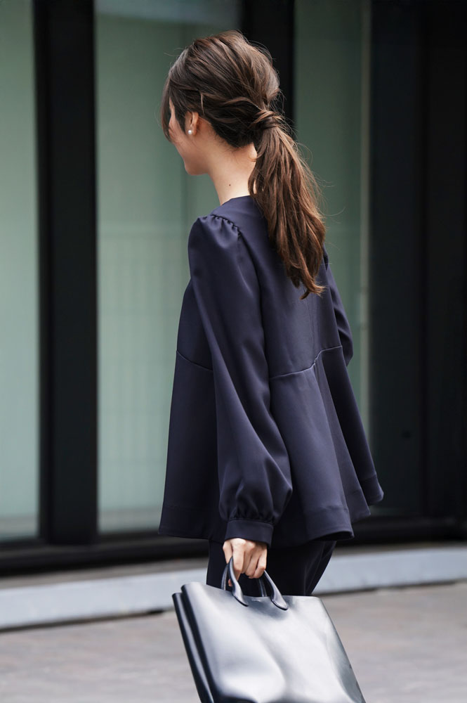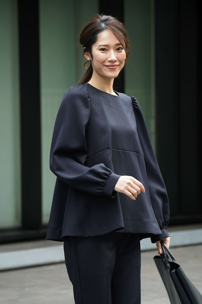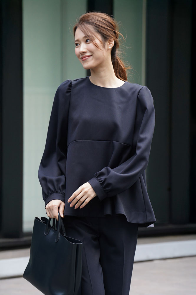 軽やかな袖のふくらみ、動きに合わせてエアリーに揺れるフレアの立体感が柔らかな印象に。