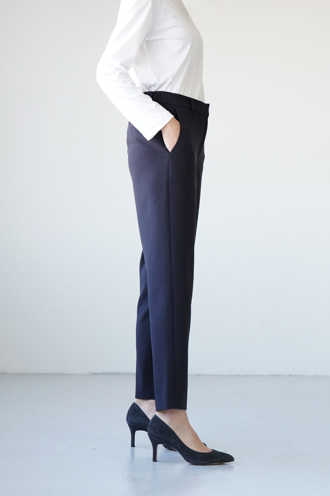 ウエスト、ヒップ、太ももには余裕を持たせ、膝上から裾にかけては、もたつかないきれいなシルエットに。