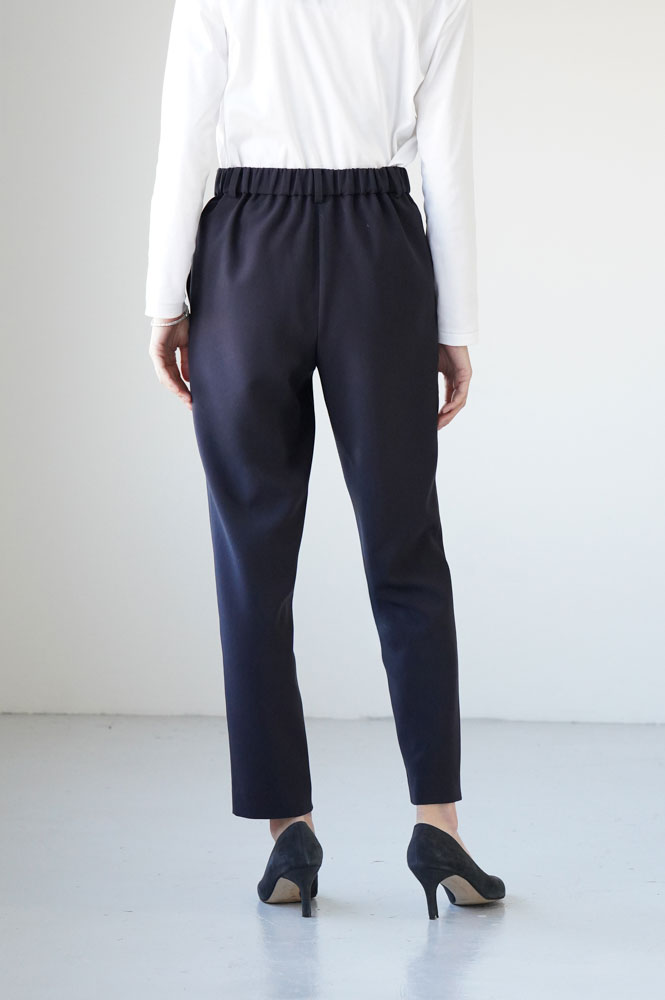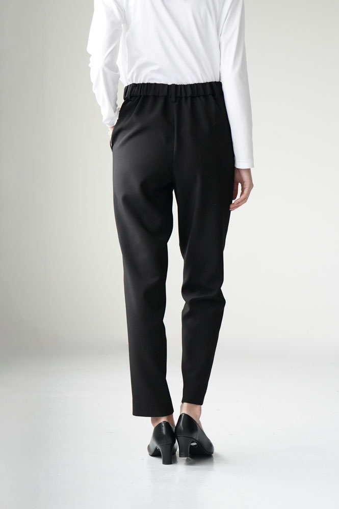 ウエスト後ろはゴム仕様にし、ストレッチ素材も相まったリラクシーな着心地が長時間の着用でも疲れにくく◎。