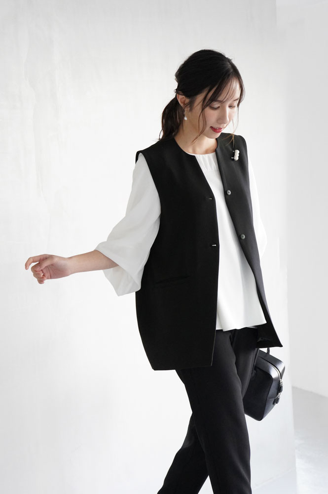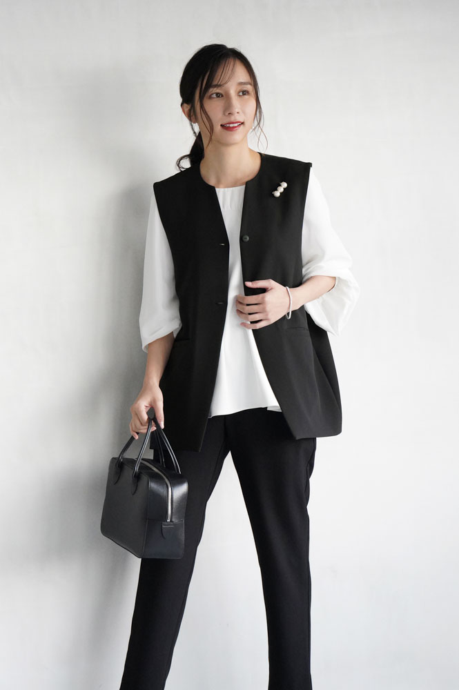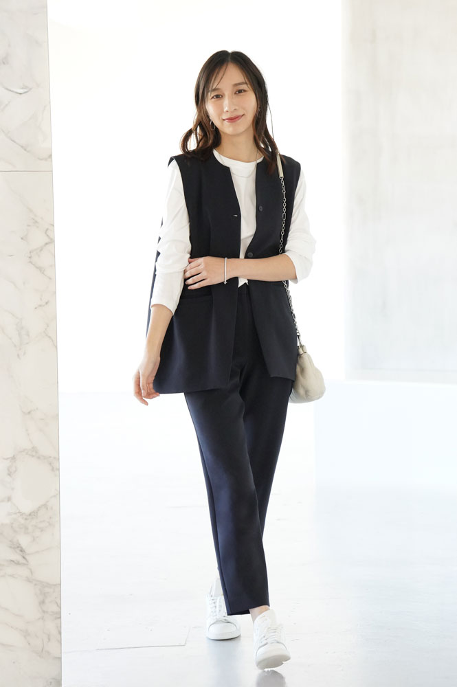 ジレ×パンツのセットアップでキレイ見えスタイルは、ジャケットほど畏まりたくはない時のベストアイテム。