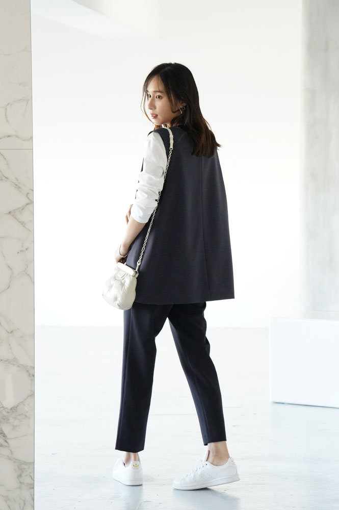 ロリエ コクーンジレ×ロリエ テーパードパンツのセットアップをカジュアルコーデにシフト。