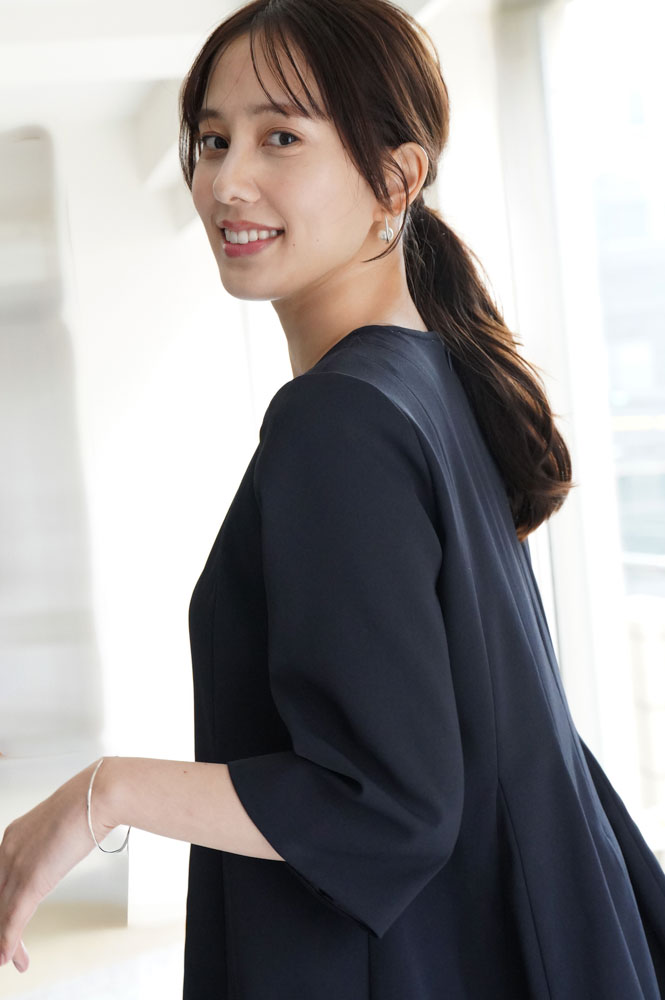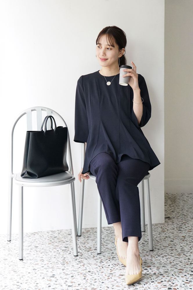 ショルダーラインから高めのウエストまで斜めに切り替えを施し、着心地にゆとりのある身幅ながらも視覚効果でスタイルアップ見え。