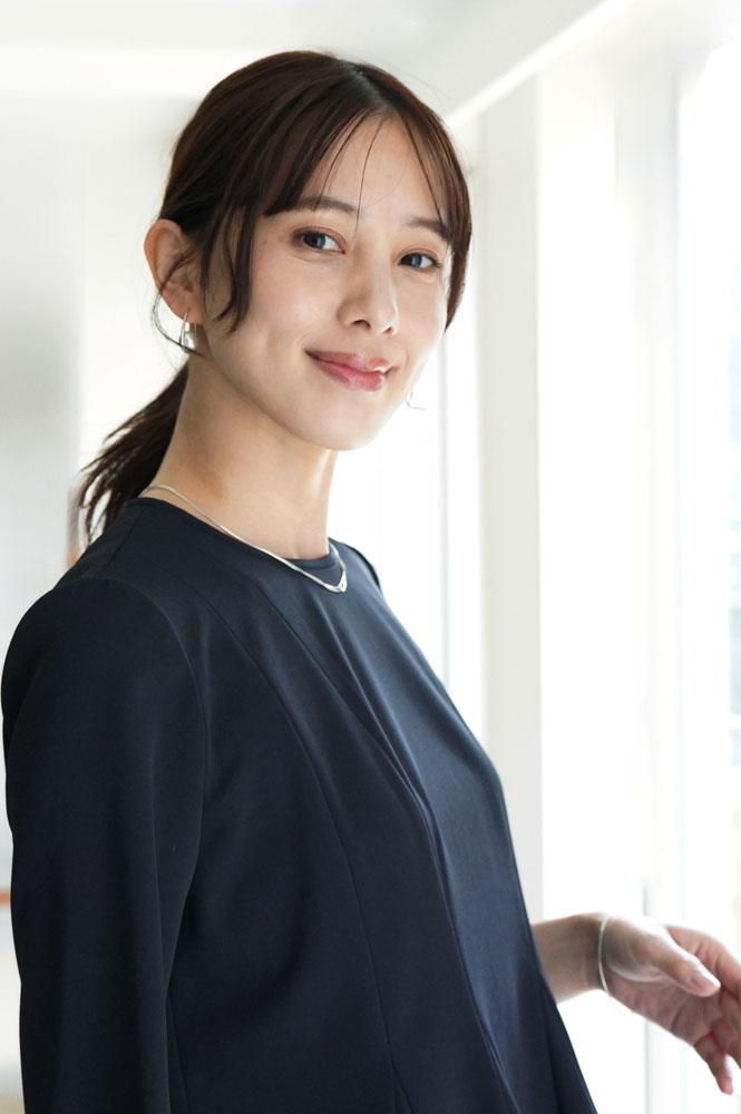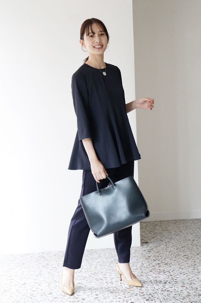 ネイビーらしく柔らかくも凛とした雰囲気を放ち、上品に軽やかな華やぎを添えるようなブラウス。