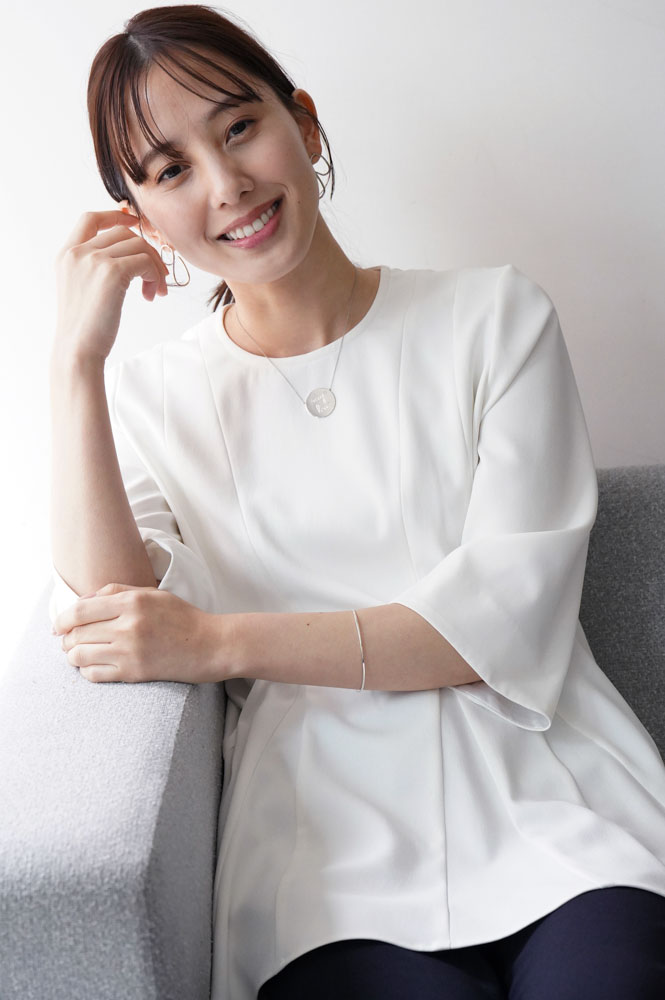 装飾も少なく、配色のないワンカラ―のブラウスながら、洗練されたデザイン性を感じる1枚。