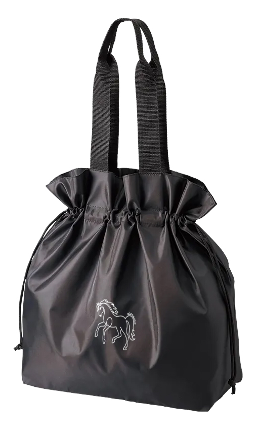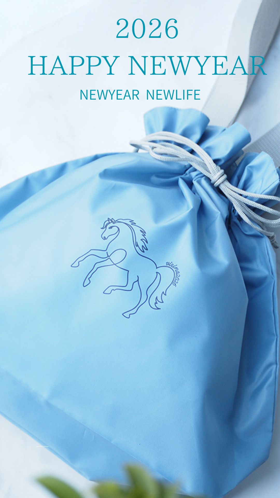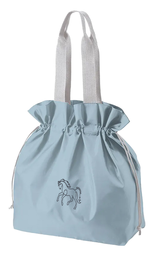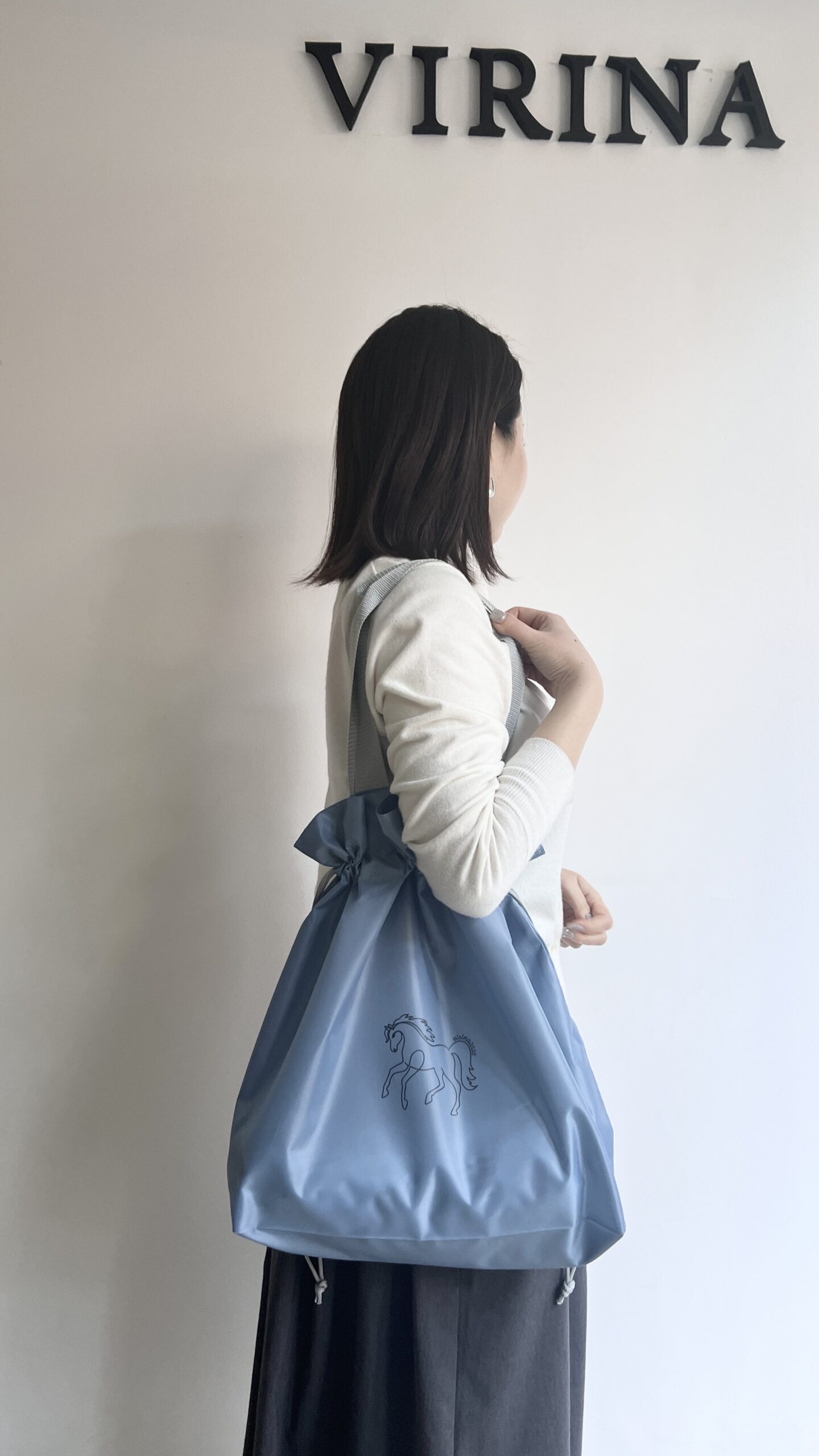 ニュアンスカラーでおしゃれなスモークブルーの巾着には、ネイビーカラーの馬プリント。