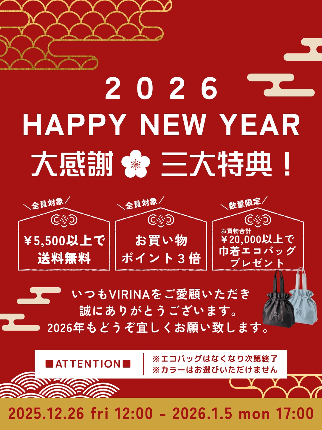 送料無料&ポイント3倍&非売品エコバッグの3大特典で,ぜひ年末年始のお買い物をお楽しみくださいませ♡