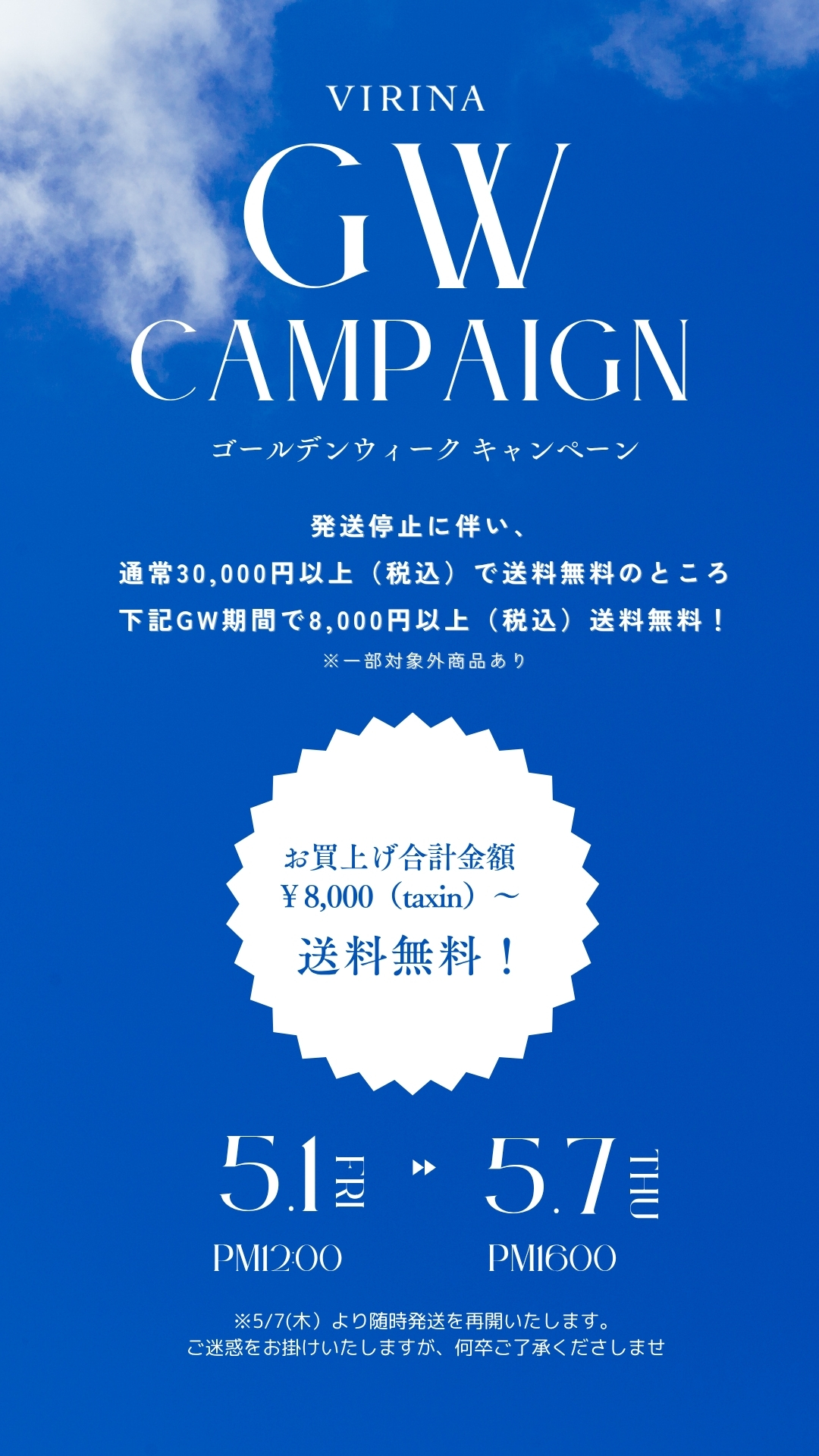 5/1(金)正午~5/7(木)16時の期間、通常税込30,000円以上、送料無料のところ、